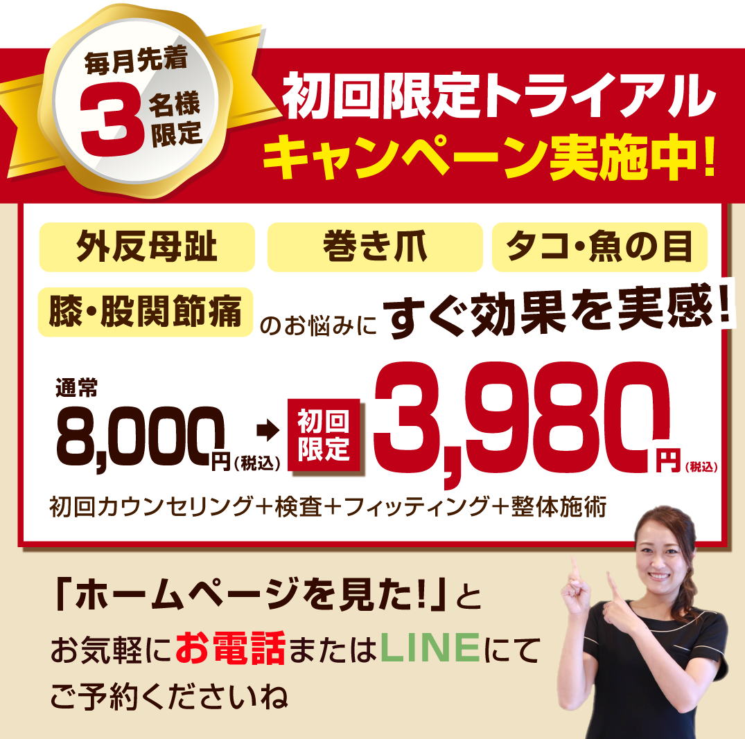| 初回の方限定 | 初回カウンセリング・検査・フィッティング・整体施術 | 初診料1,000円+施術料7,000円=通常8,000円→3,980円 |